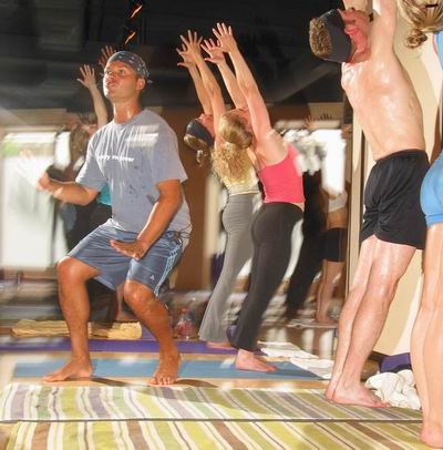 Yoga guru Baron Baptiste leads his class through an intense exercise regimen