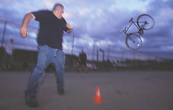 "Drillbit" eyes his silver medal toss of an old Schwinn frame during a series of annual bike-themed contests known as the SCULympics